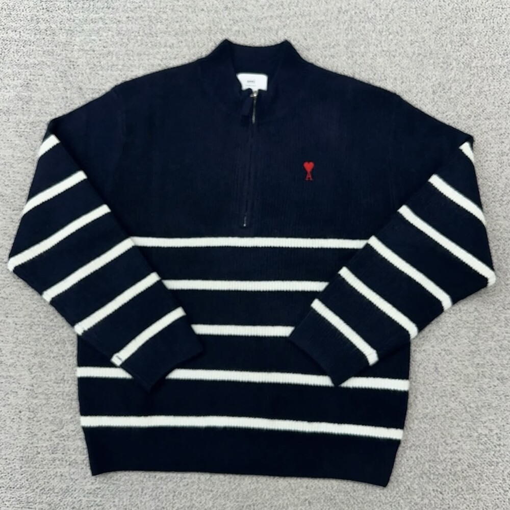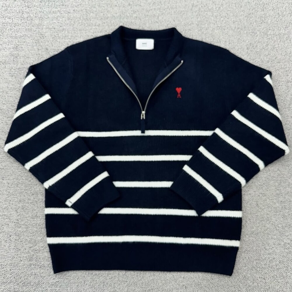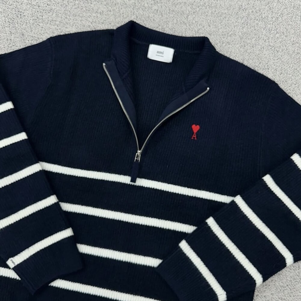 아미 네이비 스트라이프 반집업 니트