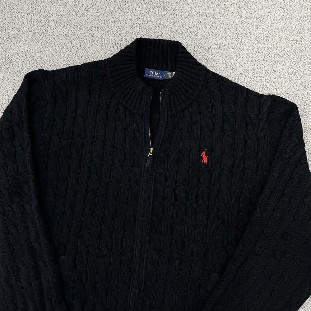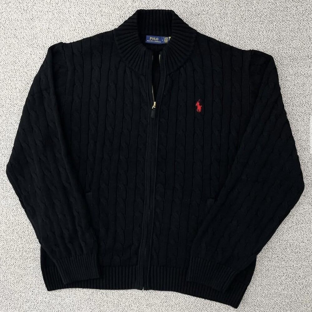 폴로 블랙 케이블 피마코튼 풀집업 니트